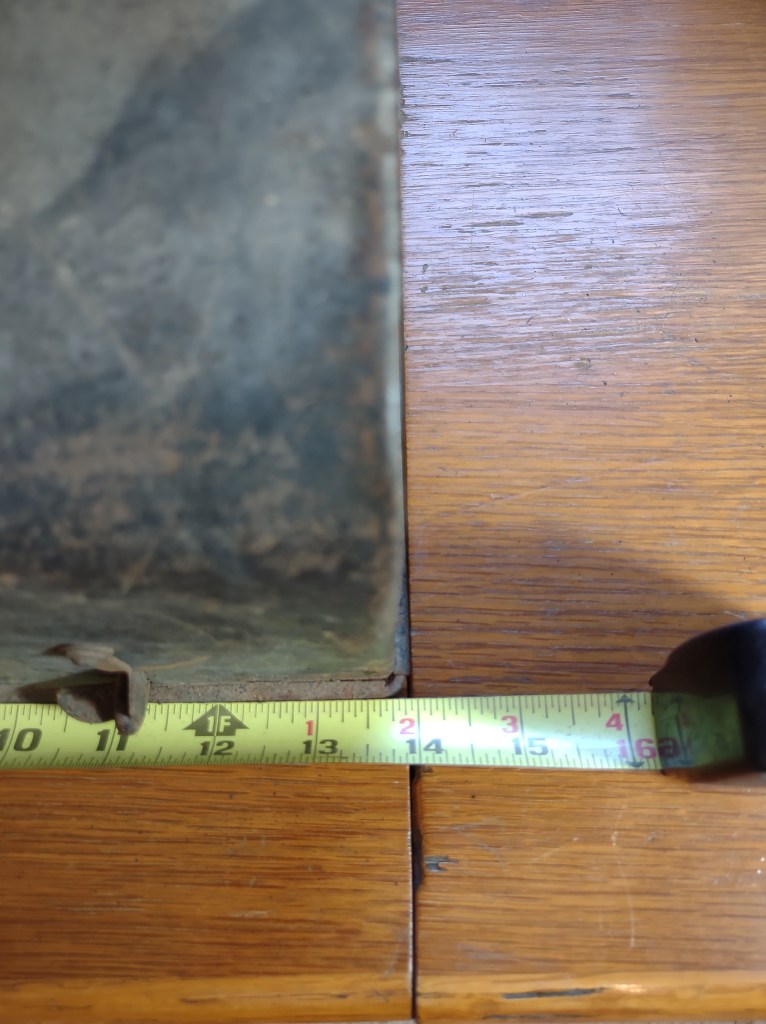 All metal, needs a cleaning, handle is secure. See photos for dimensions.